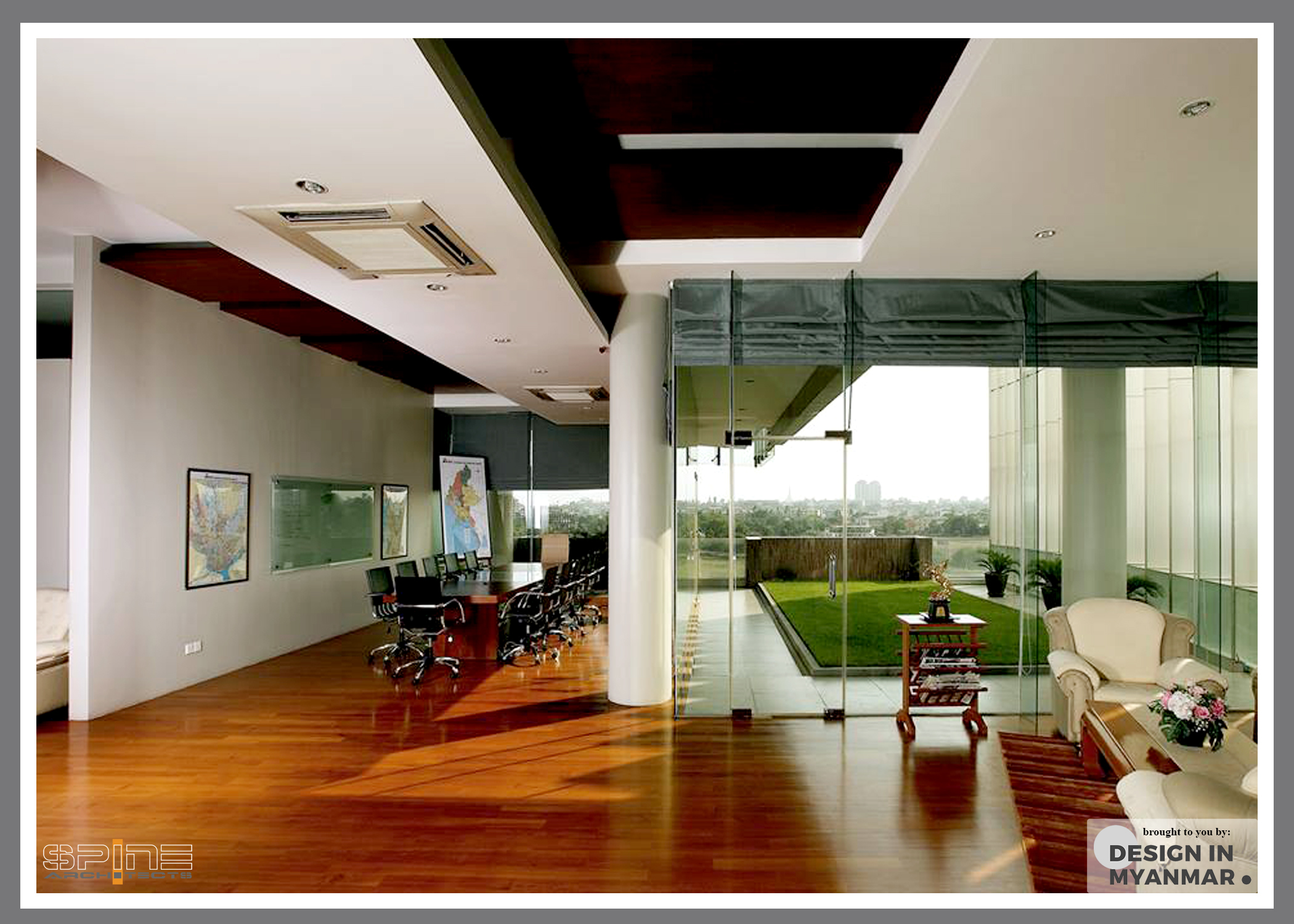 Corporate offices for a major Myanmar distribution company in a purpose-built 8 story building with pen layout workspaces, manager offices, meeting rooms, executive floors. The CEO office floor is cantilevered 12 feet with views to the Shwedagon Pagoda.